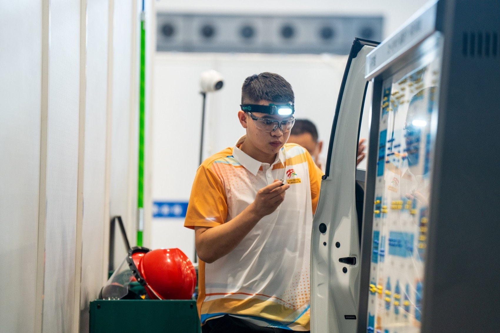 9月20日,在第三届全国技能大赛的汽车技术(世赛选拔)项目比赛现场,来自四川的朱恒生穿着赛服,手拿专业设备,全神贯注地在汽车前排除故障。